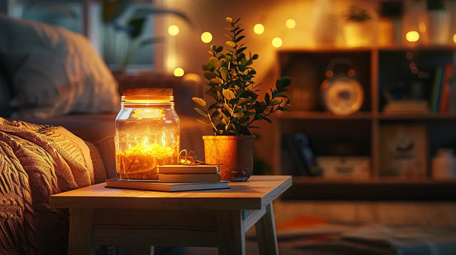 Pour votre salon, optez pour des lampes de table fabriquées à partir de pots en verre décorés. Ajoutez des boucles d’oreilles en guise de décoration sur les bords pour une touche de deco recup unique. Les lumières LED insérées à l’intérieur offriront une lumière douce et apaisante, idéale pour les soirées détente.