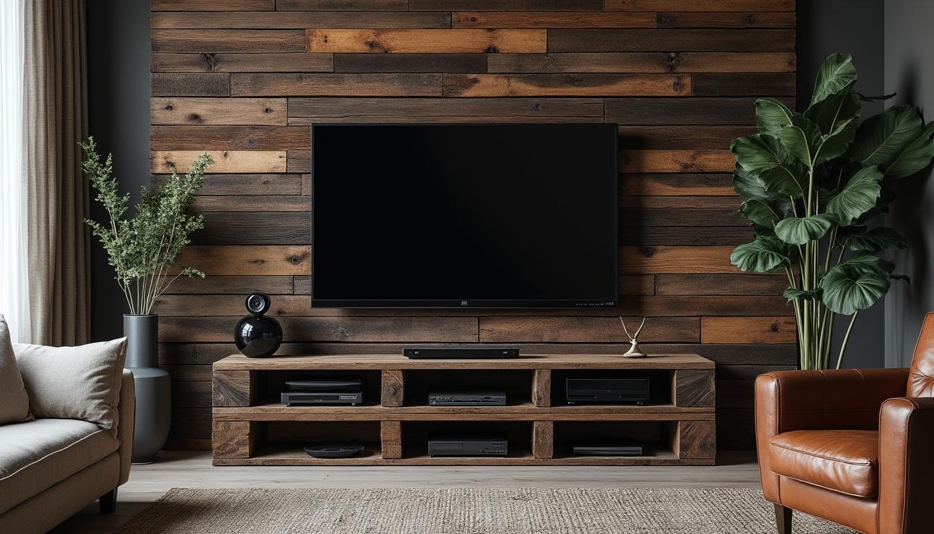 Au-delà de la structure visible, soignez l’environnement immédiat : une ossature secondaire en tasseaux ou rails métalliques permet d’installer des renforts structurels et une plinthe technique sans alourdir la façade en palettes. Pour améliorer l’acoustique, incorporez des couches d’absorption (mousse acoustique, panneaux ou laine de bois) entre la structure et le revêtement ; cela réduit les résonances et améliore la restitution sonore sans compromettre le style. Enfin, prenez des précautions préventives (traitement anti-insectes adapté, matériaux ignifugés pour les zones proches des prises) et laissez des ouvertures de ventilation dissimulées pour assurer durabilité et sécurité. Ces petits aménagements techniques garantissent un mur TV en palette noire aussi pratique que raffiné.
