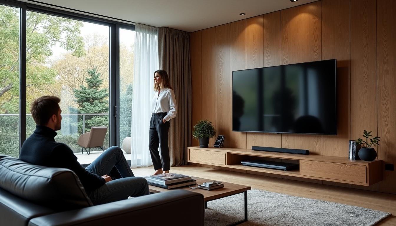 Par ailleurs, l’intégration technique doit s’appuyer sur un souci d’optimisation acoustique et de qualité d’image. Penser le local comme un ensemble acoustique — en réduisant la réverbération par des éléments absorbants, en plaçant des diffuseurs ou en ajoutant un tapis pour limiter les ondes stationnaires — améliore la clarté des dialogues et l’immersion. Le calibrage régulier de l’écran (réglage de la colorimétrie, balance des blancs et gestion du gamma) assure une restitution fidèle des images quelles que soient les conditions ambiantes ; des outils de calibrage ou des profils prédéfinis peuvent être envisagés pour différents scenarii d’usage. Enfin, intégrer des solutions de gestion d’énergie et de sécurité, comme des prises protégées et un accès simplifié aux connectiques, permet d’allier performance et sérénité au quotidien. Ces aspects techniques et ergonomiques complètent l’aménagement visuel du salon tout en proposant une expérience télévisuelle plus confortable, durable et maîtrisée.