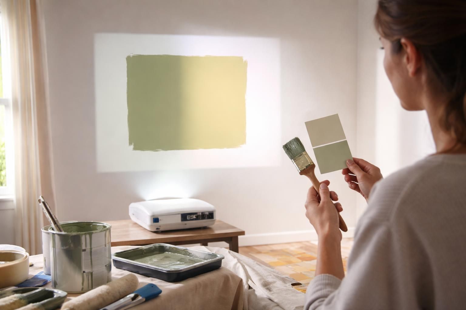Une technique moderne consiste à utiliser un vidéoprojecteur Epson pour projeter la couleur directement sur le mur. Ceci constitue une méthode de prévisualisation peinture efficace pour évaluer les teintes dans des conditions réelles d’éclairage et d’espace. Avec la possibilité de comparer différentes teintes, cette approche réduit le stress lié au choix de la peinture.